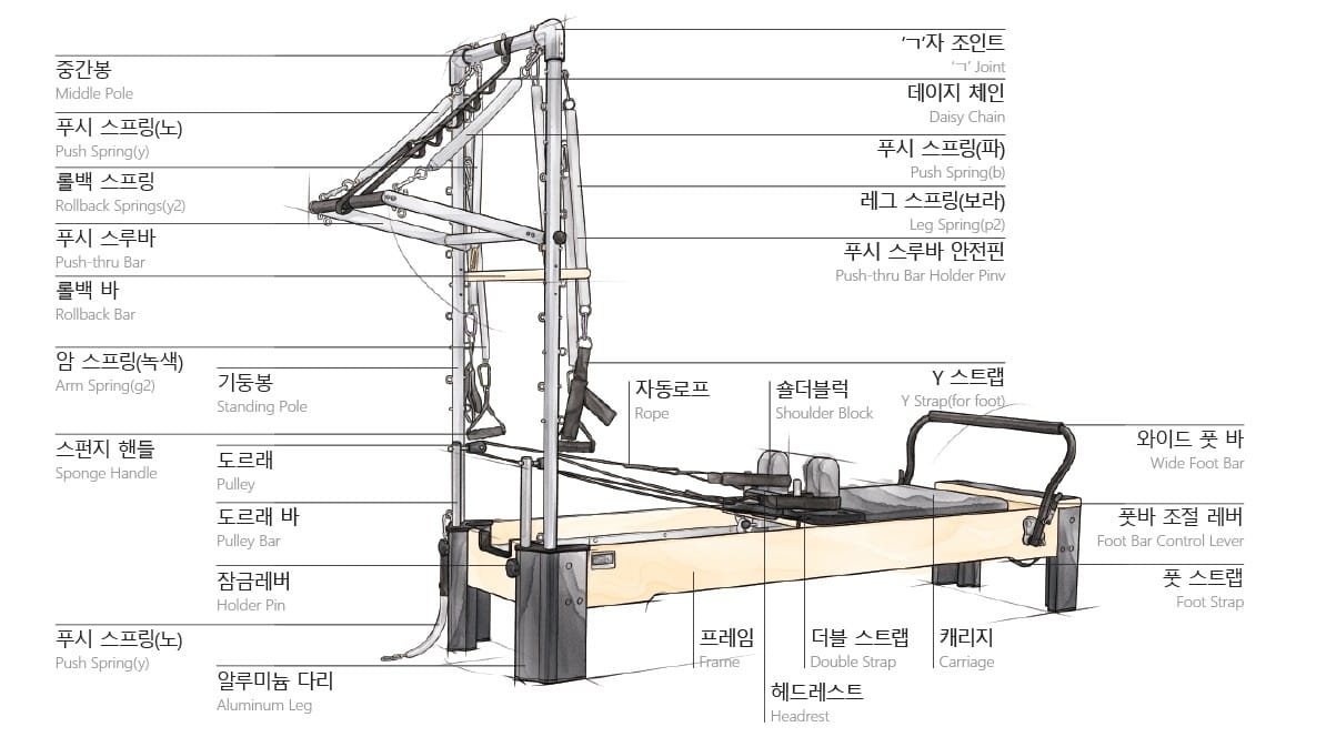 Reformer It is the most representative equipment devised by Joseph Pilates and is the most famous among Pilates equipment. It is also called the flower of Pilates because with this one equipment, more than 100 exercises can be done. Combi Reformer enables to do balanced exercise on the mat more easily, so it is used for rehabilitation or control exercises for the spine and muscles. It is equipment that focuses on qualitative strengthening and balance rather than quantitative strengthening of muscles. It is possible to do more diverse motions than Modern Reformer, and it is easier to use in a narrow space than Caformer.